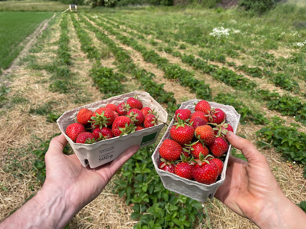 Zur Saison bieten wir an der Straße (je nach Ernte) u.a. unsere berühmten Erdbeeren und Tomaten an.